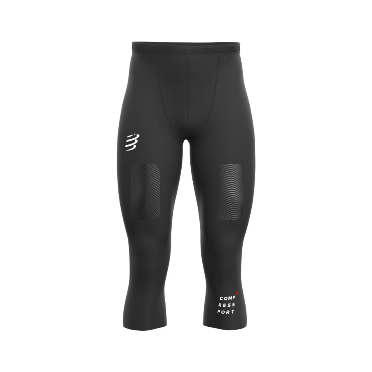 Heat-controlling, 3/4-length compressive running tights providing optimal muscle support for trail running in cooler conditions