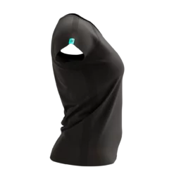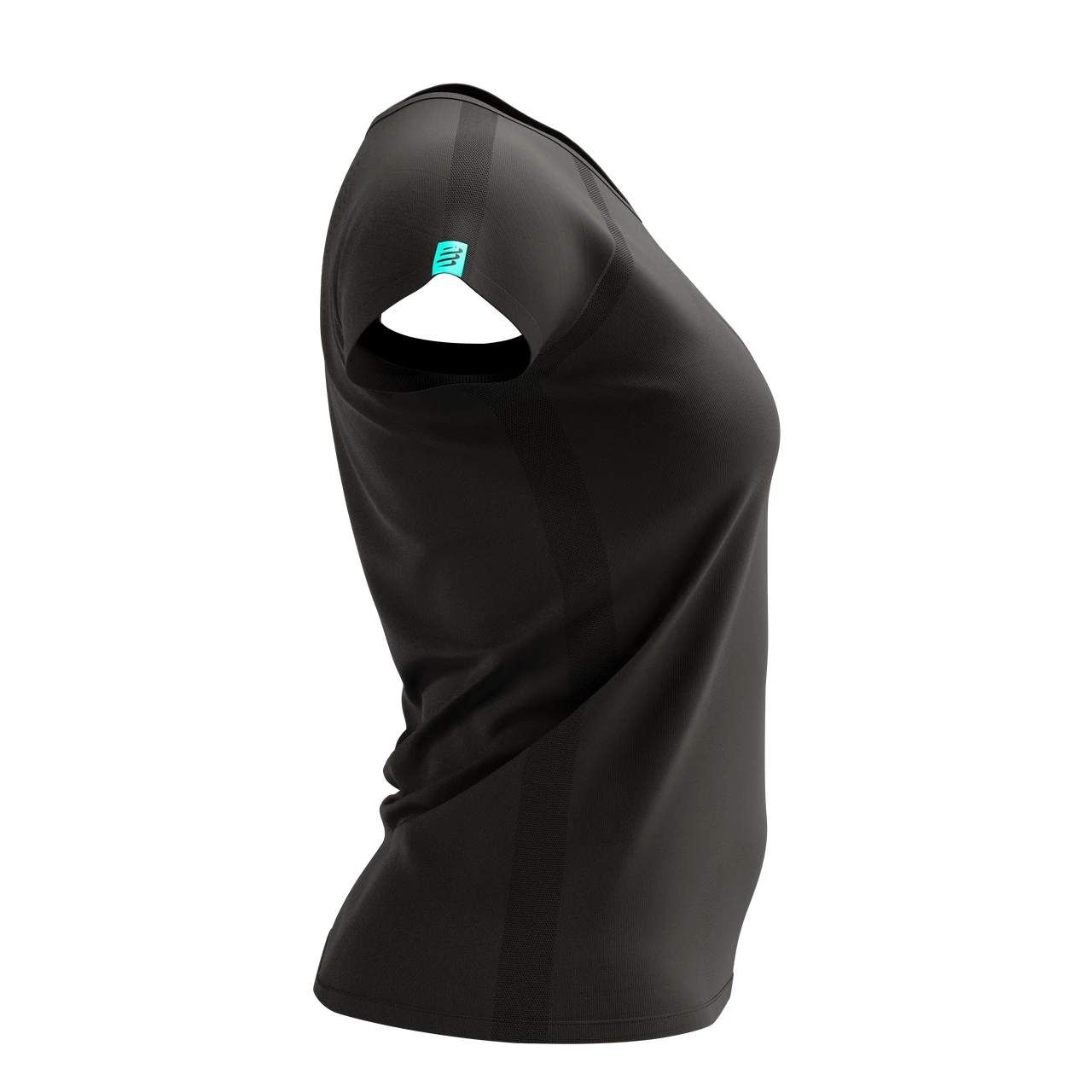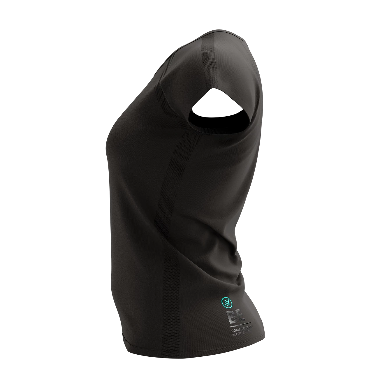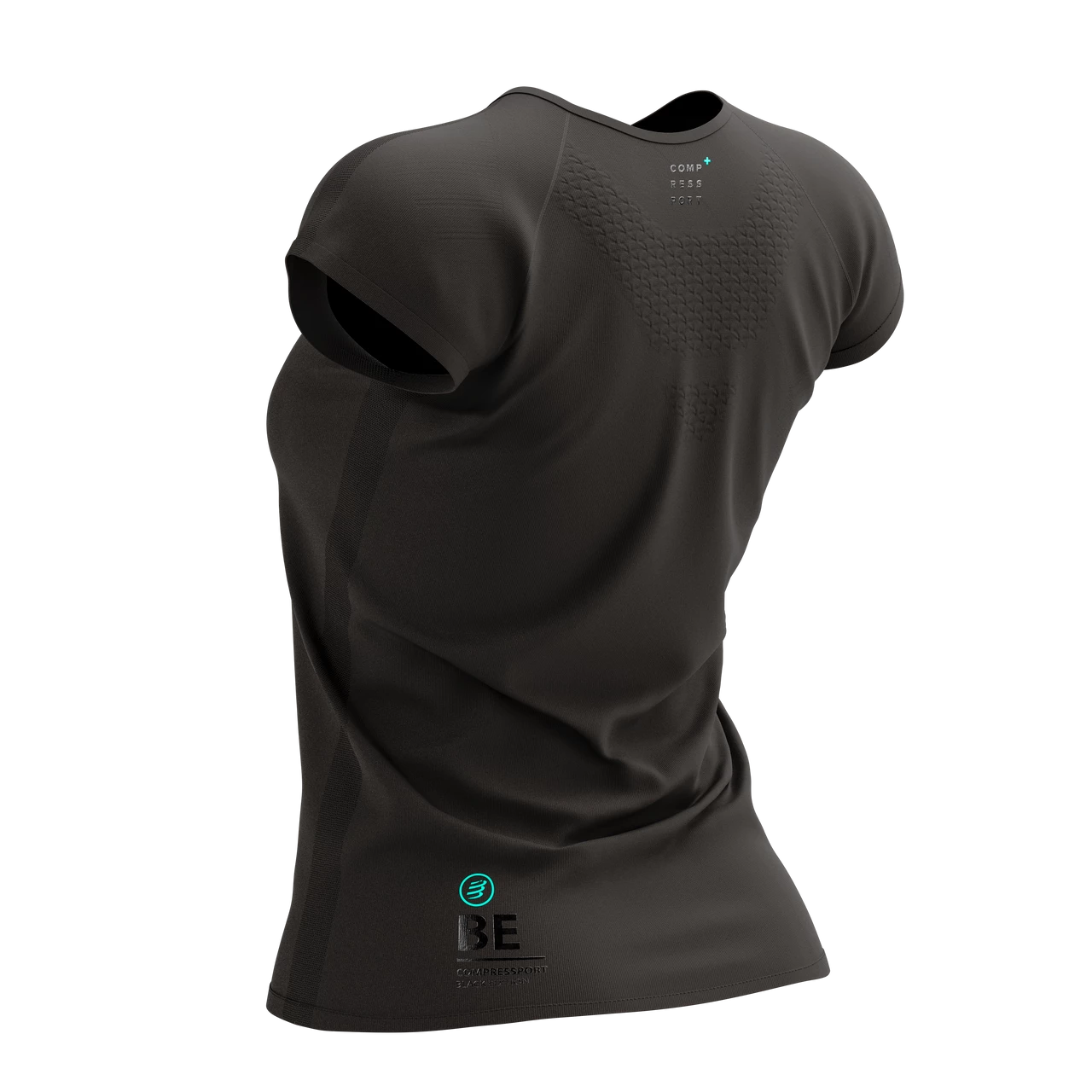 Be fast. Be feminine. The women’s limited Black Edition Training SS Shirt combines sports performance with urban sass for multisport sessions and city exploring. Designed by women, for women, this microfiber sports T-shirt takes working out in style to a whole new level. Ultra-soft, ergonomic and highly-functional, you can say goodbye to irritation and chafing now. With a 3D thermo weave that quickly wicks away sweat and moisture, you’re guaranteed to stay cool and dry during exercise. Our unique Spin Control technology is woven into the back to help you maintain a correct posture, even when you’re getting tired. The Regular fit offers a loose yet slim cut that is totally unrestrictive, but not so baggy it catches or gets in the way as intensity builds. The waistline is pinched slightly to follow your curves, while the shallow V-neck sits flat and comfortable against your skin. The feminine, capped sleeves free up the shoulder area for total range of movement, whether you’re out for a run or hitting the gym. A perfect all-rounder, the Black Edition shirt features a knitted, black-on-black Compressport logo on the front and a turquoise tab on the sleeve. The perfect top for home office comfort, summer runs in the park or a quick coffee with friends. Sport-chic style included.