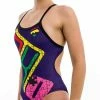 The fabric is highly structured, ensuring excellent shape retention, optimal support and targeted compression to aid muscular activation, and performance. The suit is designed to mould to the body like a second skin with sleek metallic gold thread, flatlock low profile seams for a snug fit, and stylish appearance. The open back design provides unrestricted movement for all swimmers.